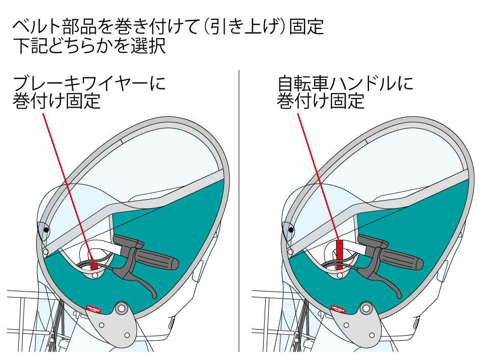 「ボタン付きベルトV」を「ブレーキワイヤー」もしくは「自転車ハンドル」のどちらかに巻付け(引上げ)固定して下さい。