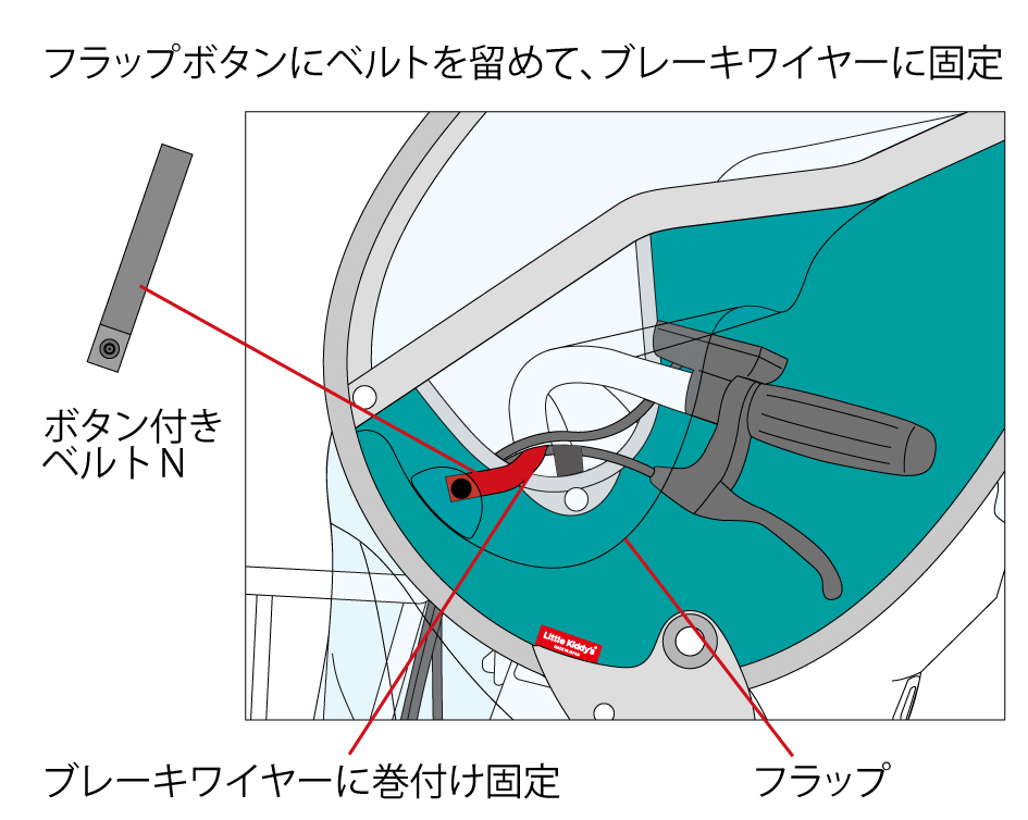 フラップボタン(黒)の裏面側に「ボタン付きベルト N」のボタンを結合し、ベルトをブレーキワイヤーに巻き付けて固定して下さい。
