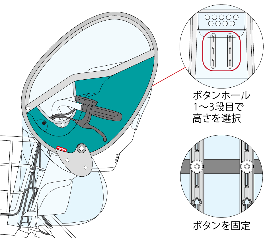 チャイルドシートに取り付けた「ボタン付きベルトH」の白ボタンを、レインカバー背面の「ボタンホールの1~3段目」からお子様の身長に合わせて選んで取付けます。