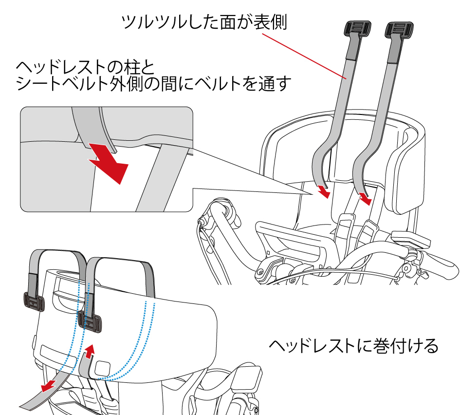ヘッドレストの柱とシートベルト外側の間に通し、ヘッドレストを一周するように巻付けます。(巻き付け方法の詳細は下記動画及びイラスト参照)
