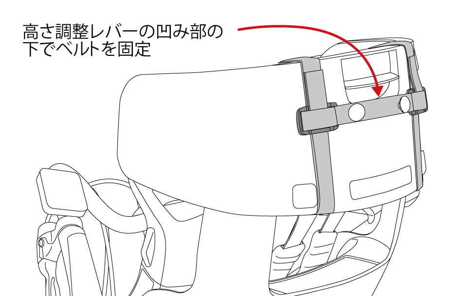 ヘッドレストの「高さ調整レバー」の下にアジャスターが来るように巻付け固定します。