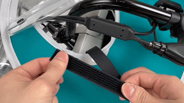 ・ブレーキワイヤーに固定する場合は、 ワイヤーは車種により本数や通り方が異なりますが、任意で選択し「レインカバー本体」を少し引き上げるようにして固定します。