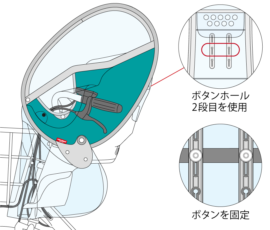 チャイルドシートに取り付けた「ボタン付きベルトH」の白ボタンを、レインカバー背面の「ボタンホールの2段目(お子様の身長によっては3段目)」に取付けます。
