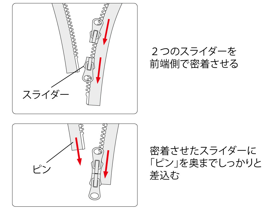 2つのファスナースライダーを前端側で密着させ、ピンを奥までしっかり差し込んでから、後ろ側のファスナースライダーを引き上げて下さい。