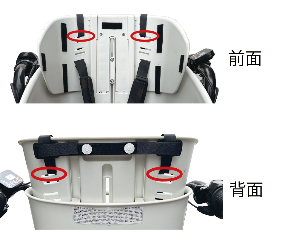 チャイルドシートのヘッドレスト等に「アジャスター付きベルトG」2本を巻付けます。