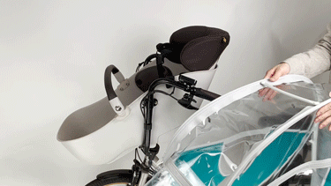 シートの後方から、レインカバーの向きを変えて自転車のハンドルに差込みます。