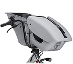 シートの後方から、レインカバーの向きを変えて自転車のハンドルに差込みます。