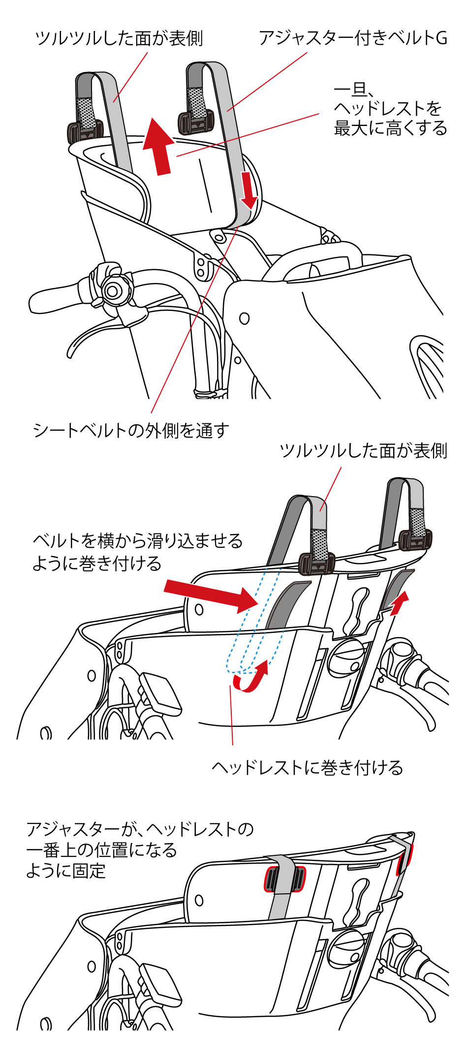 「アジャスター付きベルトG」2本を、シートベルトの穴に通しながらヘッドレストに巻付け、 アジャスターに通して引き絞るように固定して下さい。