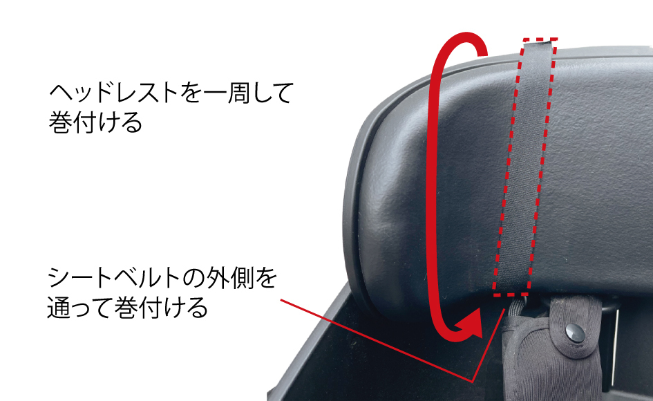 ヘッドレストの高さを一番上まで上げ、ヘッドレストを1周するように巻付けます。(巻き付け方法の詳細は下記動画及びイラスト参照)