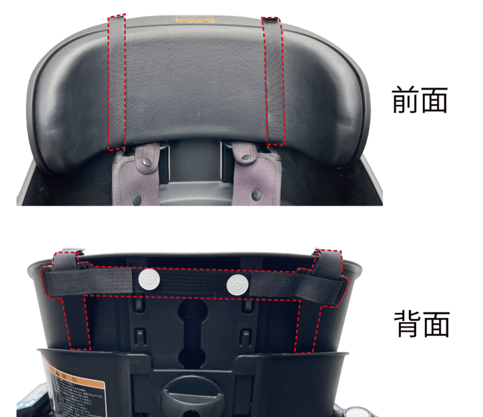 チャイルドシートのヘッドレスト等に「アジャスター付きベルトG」2本を巻付けます。