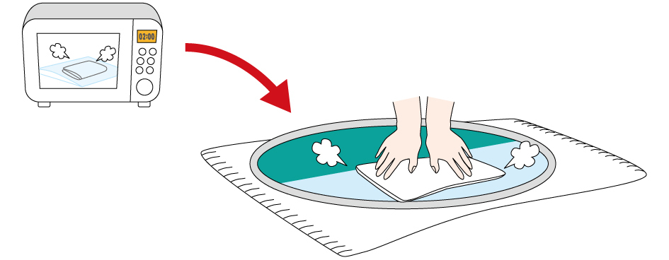 ❹ 蒸しタオルをビニールやナイロン生地のシワ部分に広げて、手で押しながらシワを伸ばして下さい。