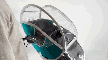 次に、足元カバーの左右を繋ぐ上部のボタン2か所を外し、チャイルドシートの開閉ハンドルを操作して乗降します。