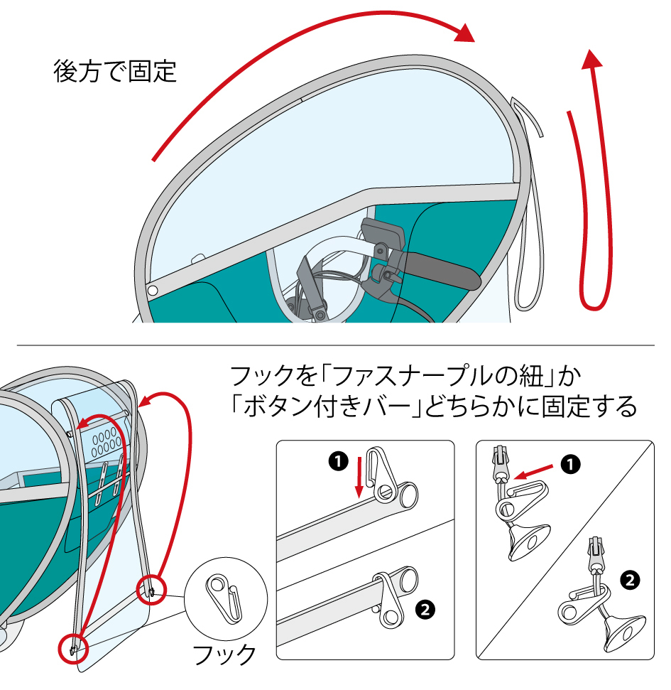 センタールーフ前端のフックは、後方側の「ボタン付きバー」または「ファスナープルの紐」に掛けて固定します。