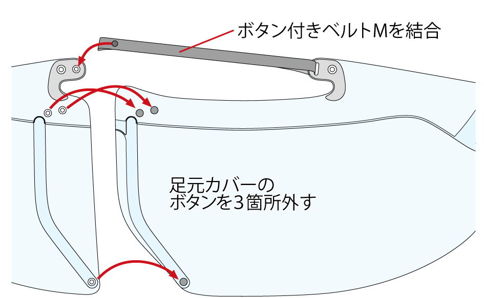 まずはじめに、「ボタン付きベルトM」を右側足元カバーと結合します。