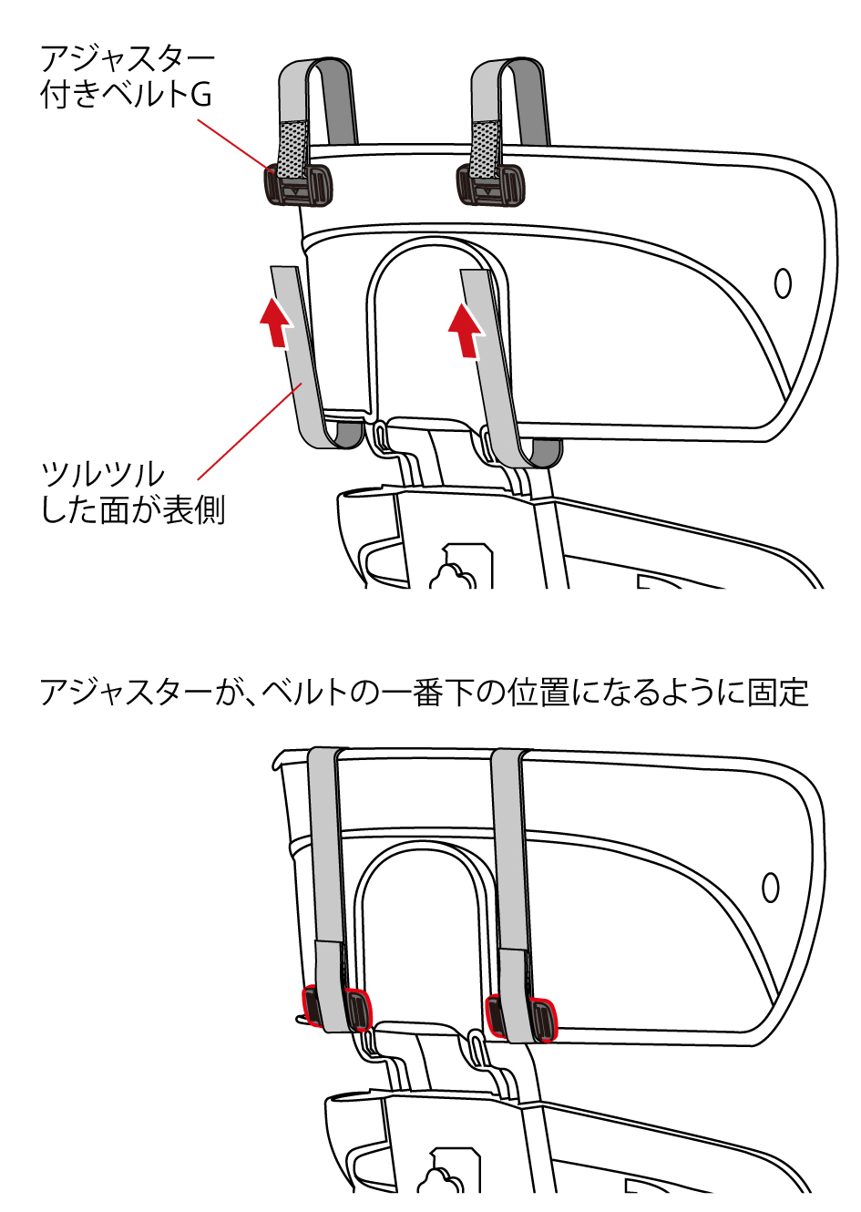 「アジャスター付きベルトG」2本をヘッドレスト(機種によってはシート背面)に巻付け、 アジャスターに通して引き絞るように固定して下さい。