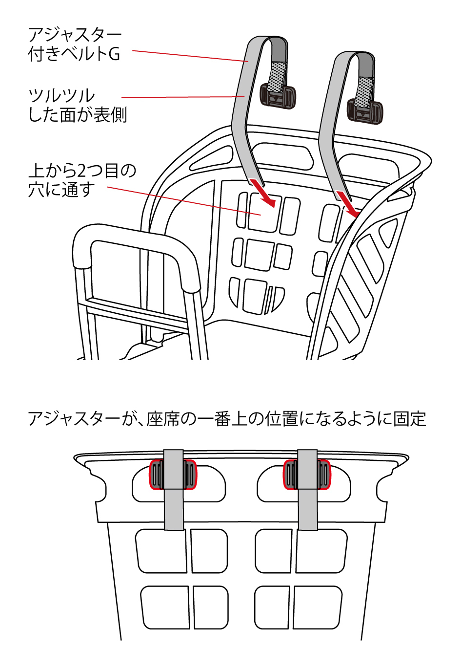 座席背面の一番上にアジャスターが来るように巻付け固定します(巻き付け方法の詳細は下記動画及びイラスト参照)