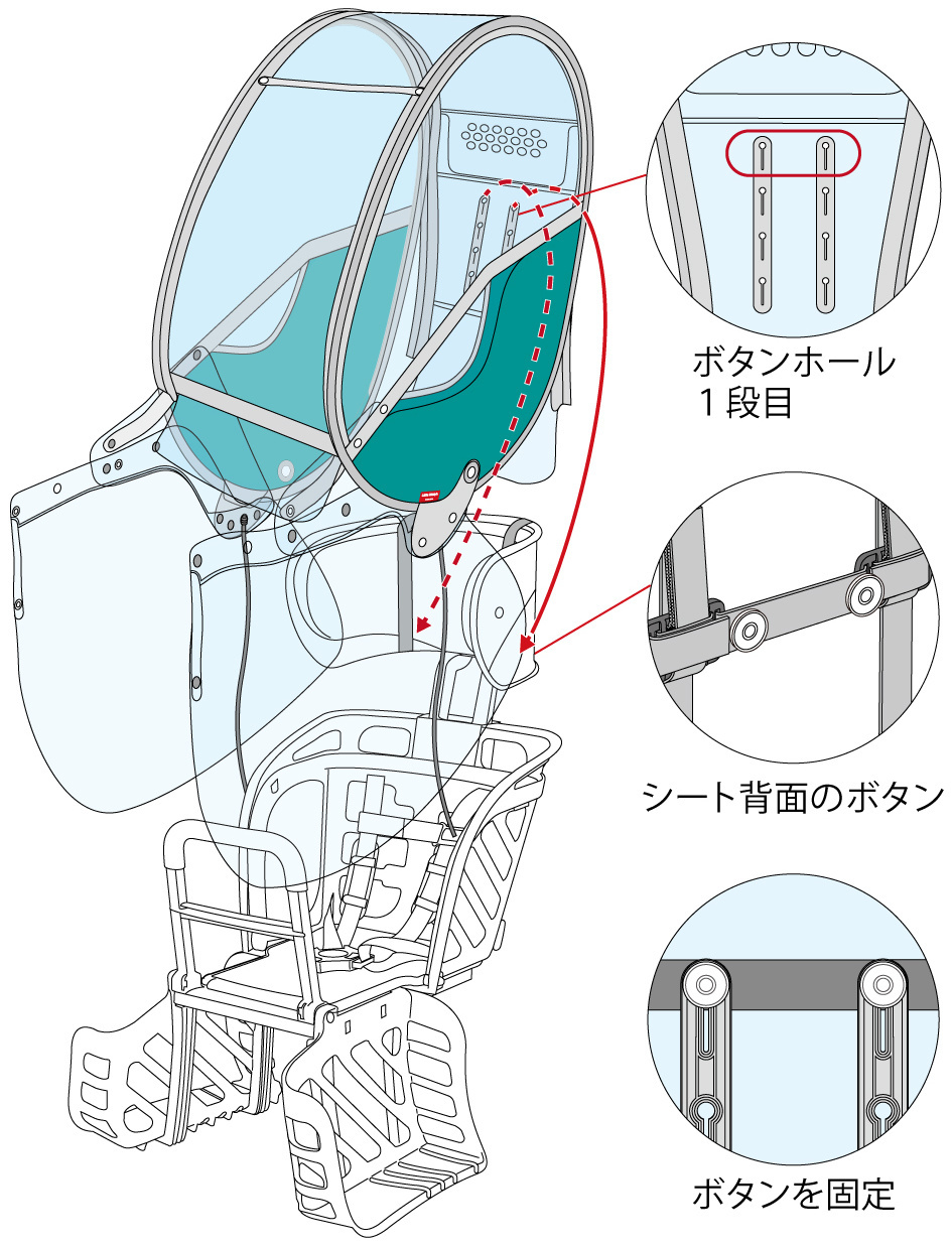 チャイルドシートに取り付けた「ボタン付きベルトH」の白ボタンを、レインカバー背面の「ボタンホールの1段目」に取付けます。
