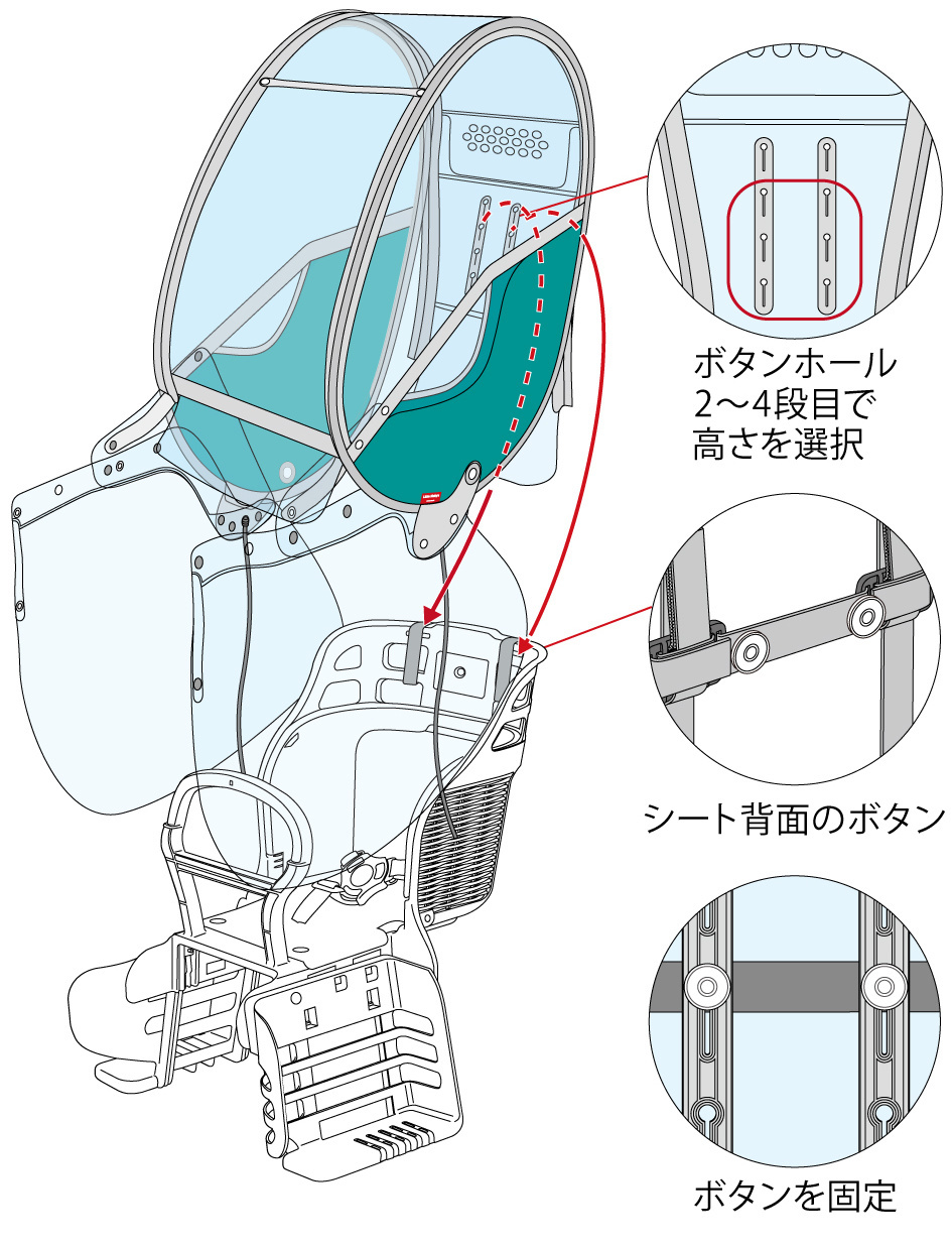 チャイルドシートに取り付けた「ボタン付きベルトH」の白ボタンを、レインカバー背面の「ボタンホールの2~4段目」の中から選択して取付けます。