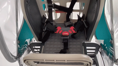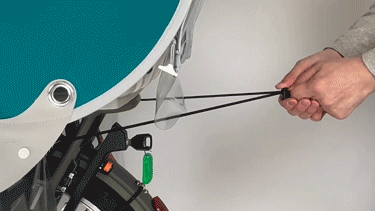 引っ張ることでレインカバーの足元部が持ち上がり、お子様が乗車した時の室内空間(手元足元部分)が広くなります。