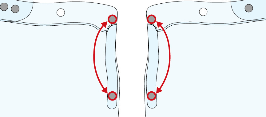 内側のスリットに通し終えたタイミングで、左右のアジャスターを内側に引き寄せるようにベルトを外側に引き出し、装着を安定させます。