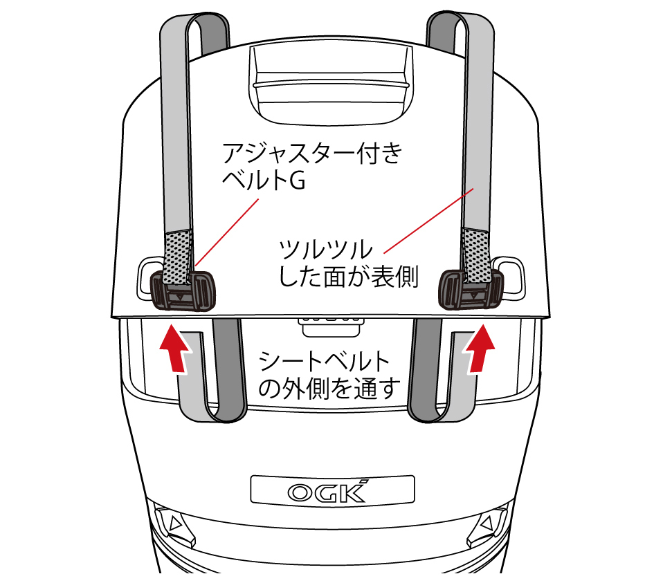 チャイルドシートのヘッドレスト等に「アジャスター付きベルトG」2本を巻付けます。
