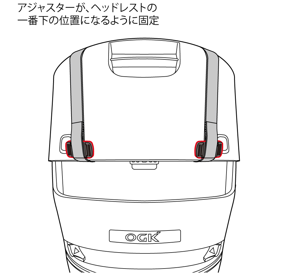 「アジャスター付きベルトG」2本をヘッドレストに巻付け、 アジャスターに通して引き絞るように固定して下さい。