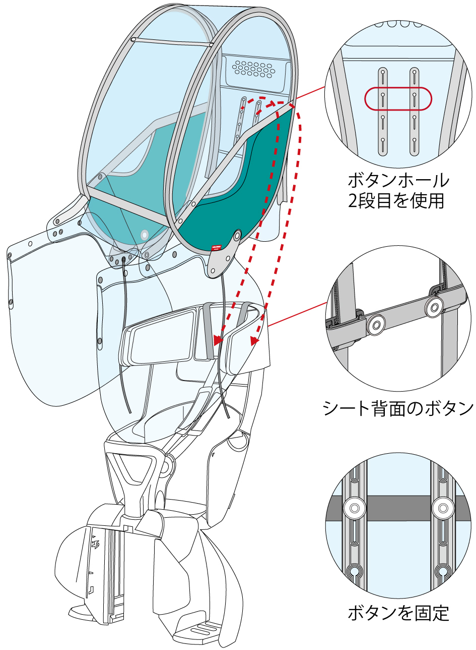 チャイルドシートに取り付けた「ボタン付きベルトH」の白ボタンを、レインカバー背面の「ボタンホールの2段目」に取付けます。