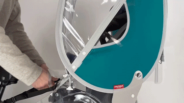 足元カバー中央部の上下のボタンを結合し、フットレストを覆うような立体形状を作ります。