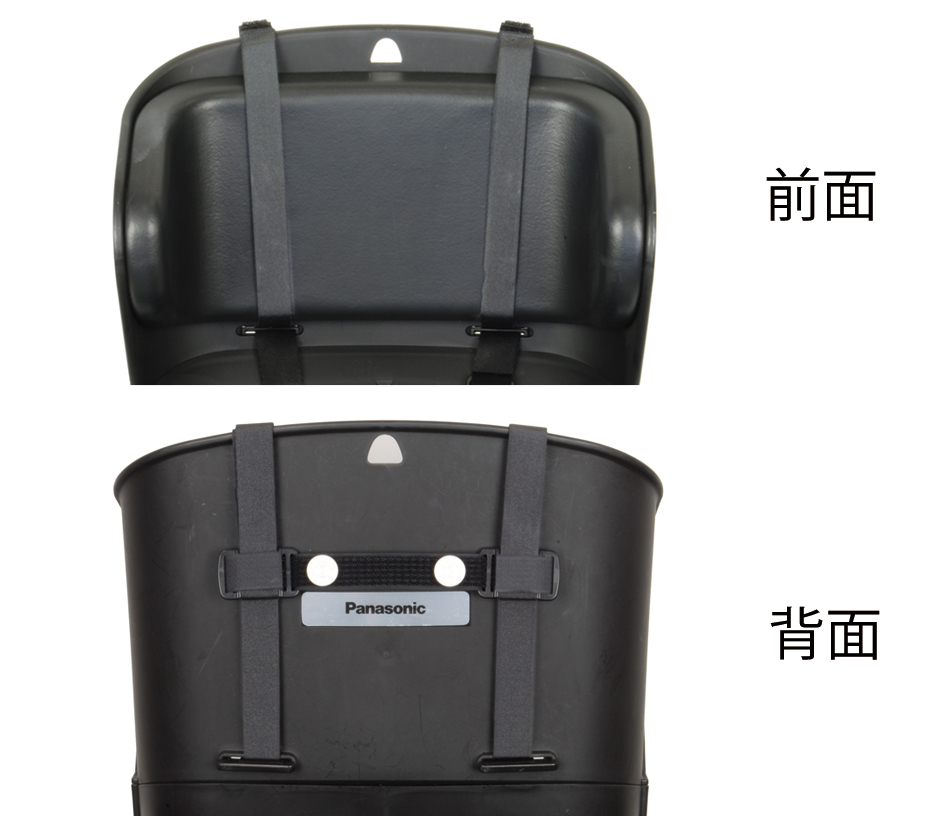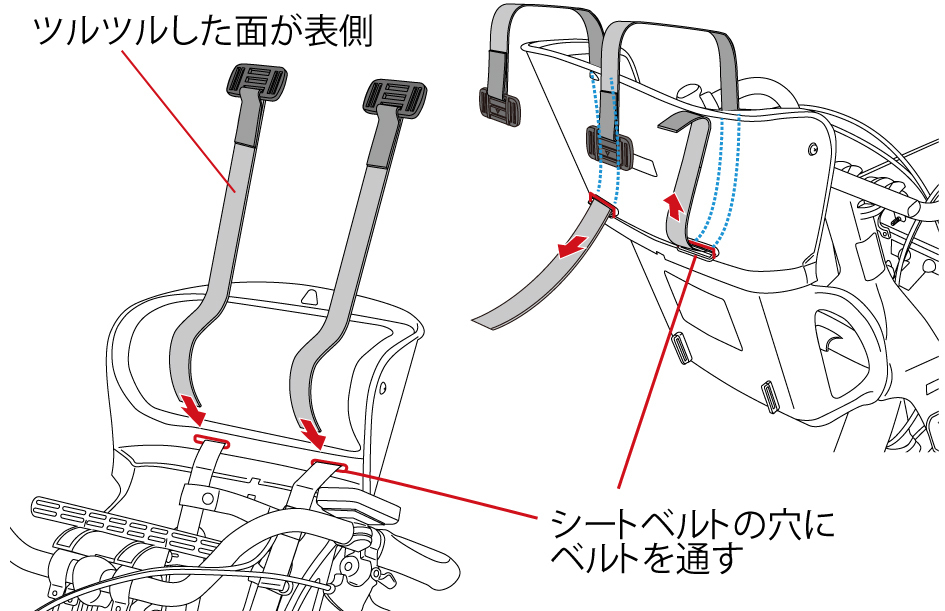 チャイルドシートのヘッドレスト等に「アジャスター付きベルトG」2本を巻付けます。