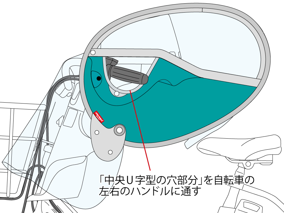 最初に、レインカバー「中央U字型の穴部分」を自転車の左右ハンドルに通します。