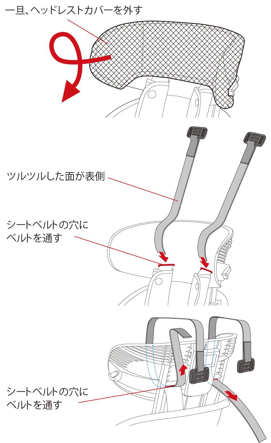 「アジャスター付きベルトG」2本を、シートベルトの穴に通しながらヘッドレストに巻付け、 アジャスターに通して引き絞るように固定して下さい。