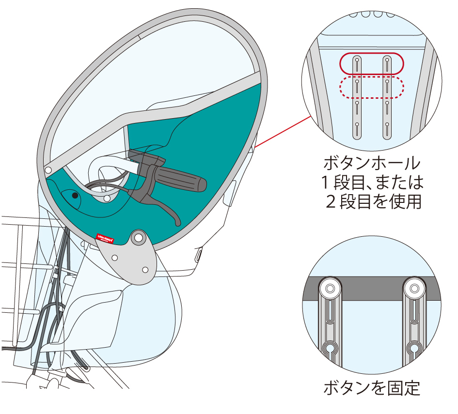 チャイルドシートに取り付けた「ボタン付きベルトH」の白ボタンを、レインカバー背面の「ボタンホールの1段目」に取付けます。