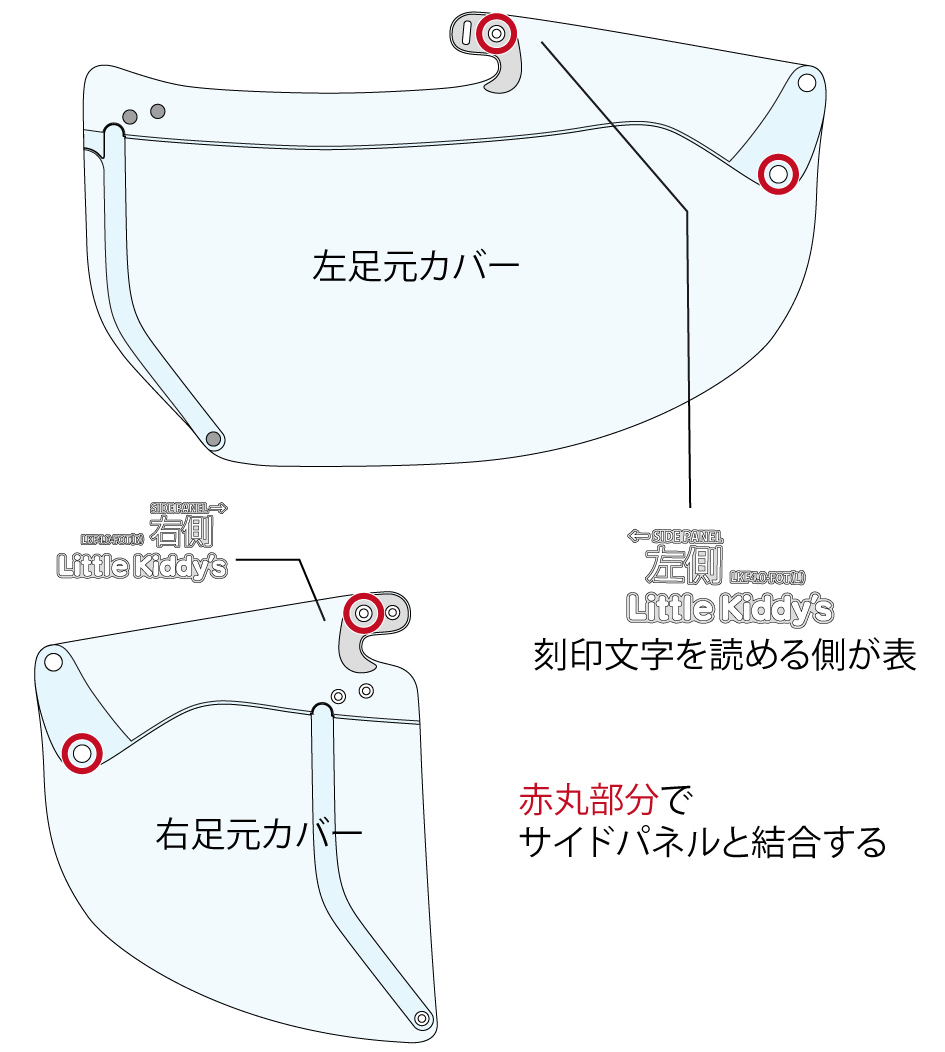 「足元カバー」と「サイドパネル」を左右それぞれ3ヶ所ずつのボタンで結合して下さい。