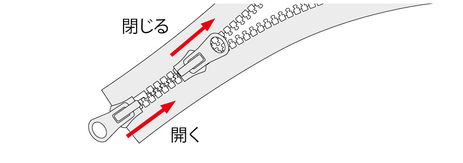 後方側のスライダーを引き上げてファスナーを閉じ、前方側のファスナーを引き上げてファスナーを開きます。