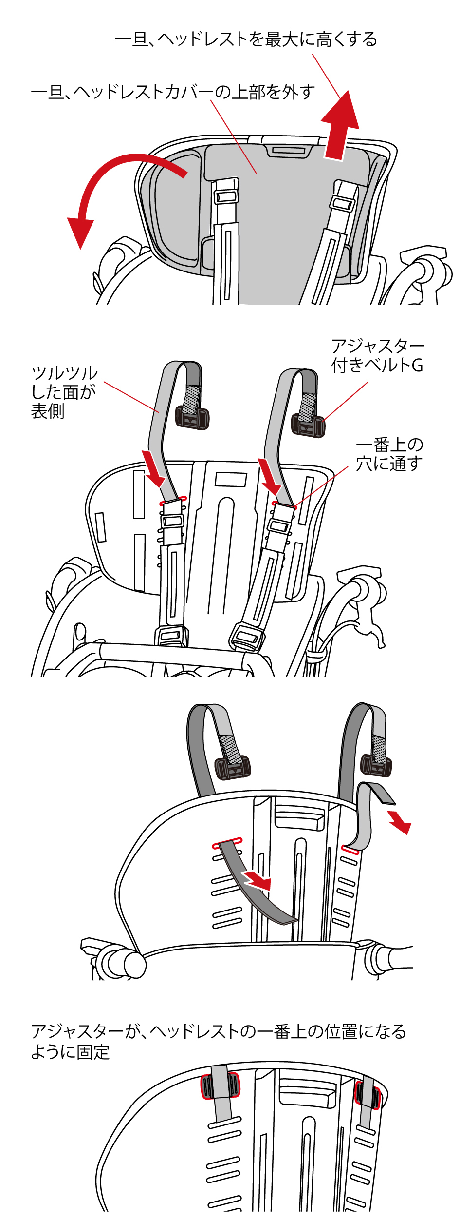 レインカバーの装着前に、チャイルドシートのヘッドレストの高さを、お子様の身長に合わせて調整して下さい。