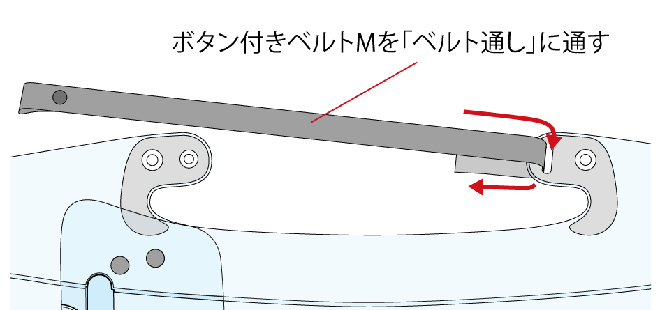 「ボタン付きベルトM」を足元カバー左側の「ベルト通し」に通します。