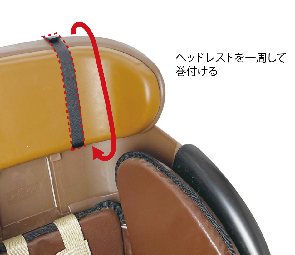 ヘッドレストの高さを一番上まで上げ、ヘッドレストを1周するように巻付けます。 (巻き付け方法の詳細は下記動画及びイラスト参照)