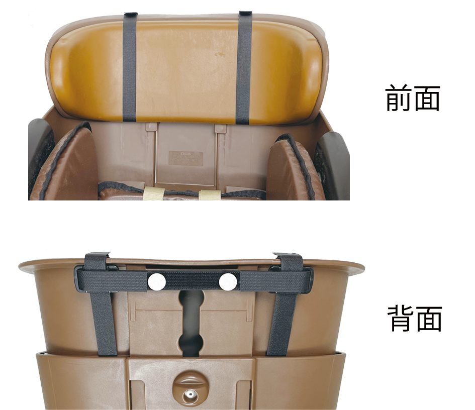 チャイルドシートのヘッドレスト等に「アジャスター付きベルトG」2本を巻付けます。