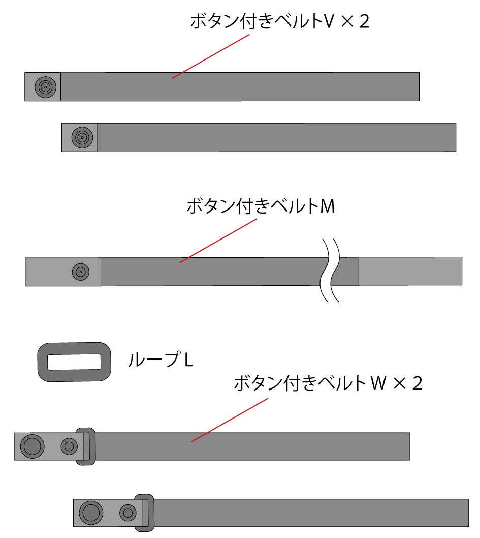 まず始めに、「ボタン付きベルトW」のボタンを、サイドパネル中央のボタンに裏面から固定してください。