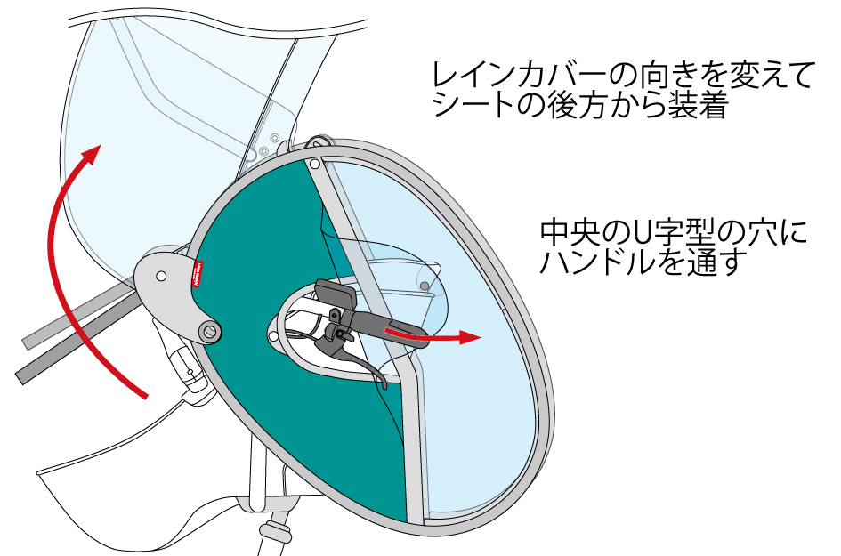 シートの後方から、レインカバーの向きを変えて自転車のハンドルに差込みます。