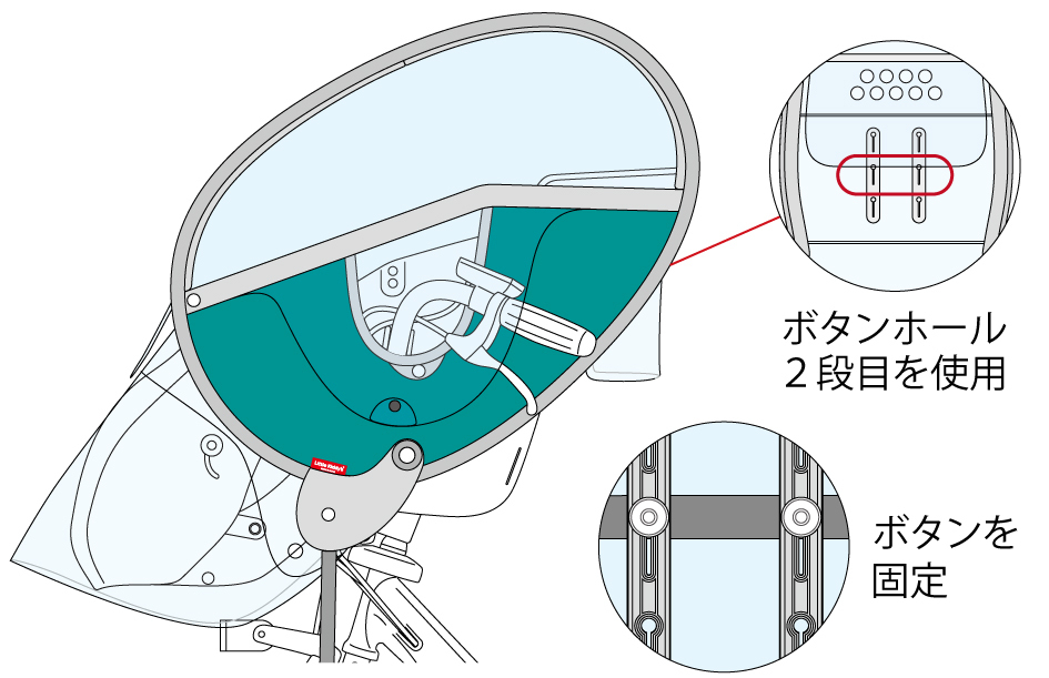 チャイルドシートに取り付けた「ボタン付きベルトH」の白ボタンを、レインカバー背面の「ボタンホールの2段目」に取付けます。