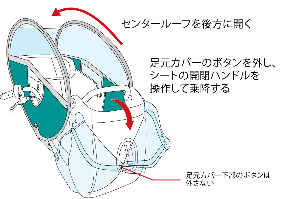 次に、足元カバーの左右を繋ぐ上部のボタン2か所を外し、チャイルドシートの開閉ハンドルを操作して乗降します。