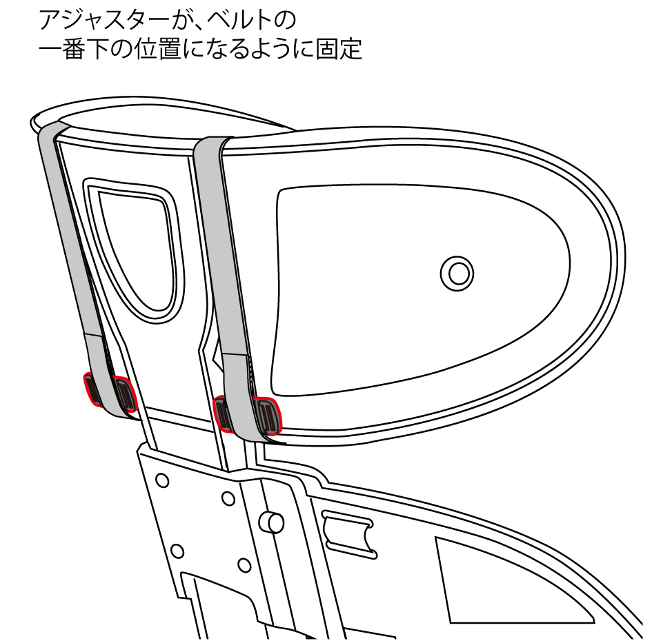 「アジャスター付きベルトG」2本をヘッドレストに巻付け、 アジャスターに通して引き絞るように固定して下さい。